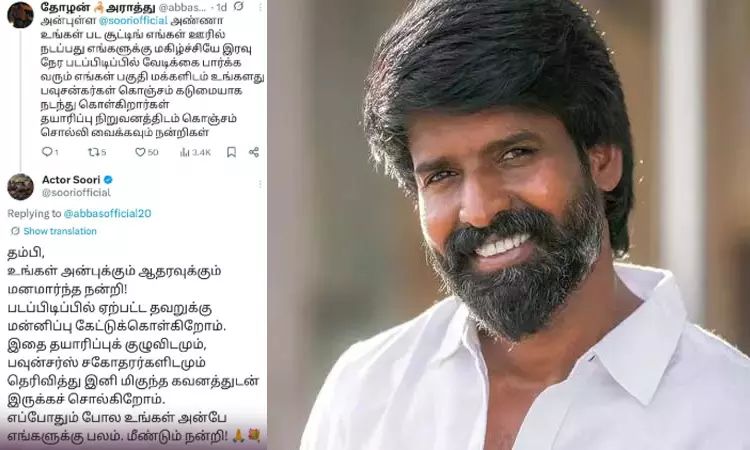 இதற்கு சூரி தம்பி உங்கள் அன்புக்கும் ஆதரவுக்கும் மனமார்ந்த நன்றி படப்பிடிப்பில் ஏற்பட்ட தவறுக்கு நான் மன்னிப்பு கேட்டுக்கொள்கிறேன் இதை தயாரிப்பு குழுவை நடமும் பவுன்சர் சகோதரர்களிடமும் தெரிவித்து இனி மிகுந்த கணவனத்துடன் இருக்க சொல்கிறேன் எப்பொழுதும் உங்கள் அன்பு எனக்கு பலம் என பதில் அளித்துள்ளார் சூரி.