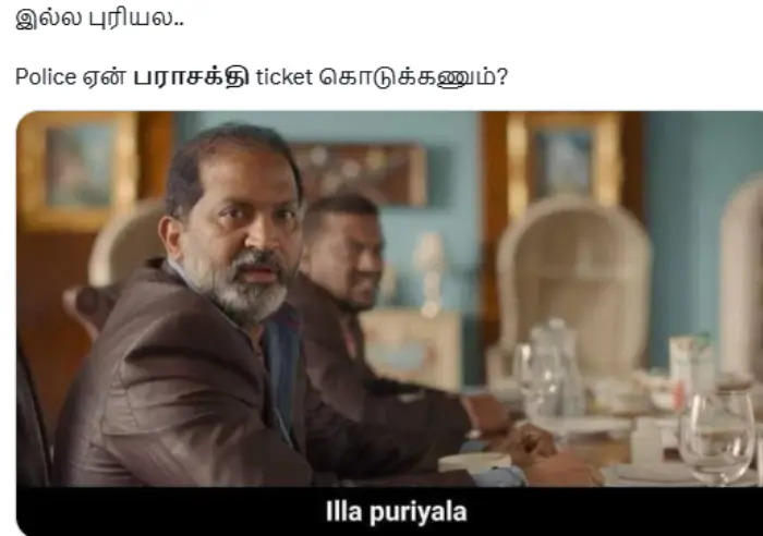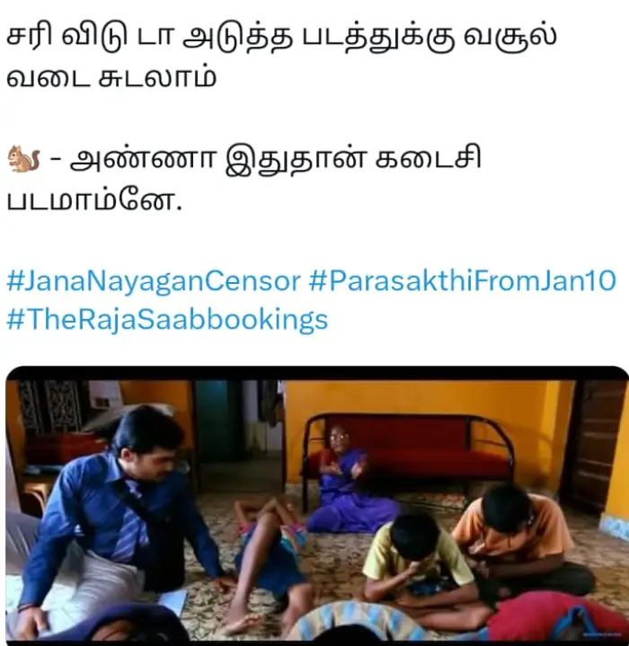 நீங்கதானே அண்ணன் படத்த பாத்துட்டு தம்பி படத்தை பார்க்க சொன்னீங்க. அப்ப ஜனநாயகன் படம் ரிலீஸ் ஆகட்டும் அதுக்கப்புறம் பராசக்தியை பாக்குறோம் வரட்டா என கலாய்த்து மீம்ஸ் போட்டு வருகின்றனர்.